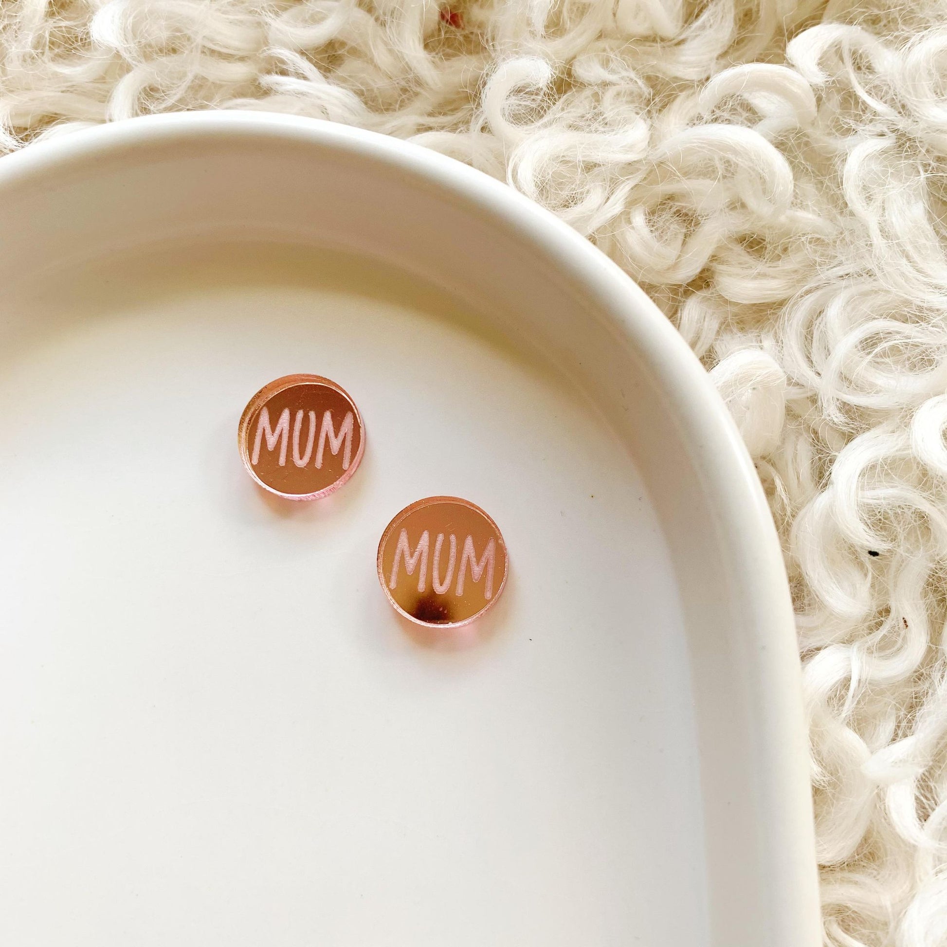 Pair of Circle Earring Stud Blanks Engraved with Mum as pictured. 15mm Diameter