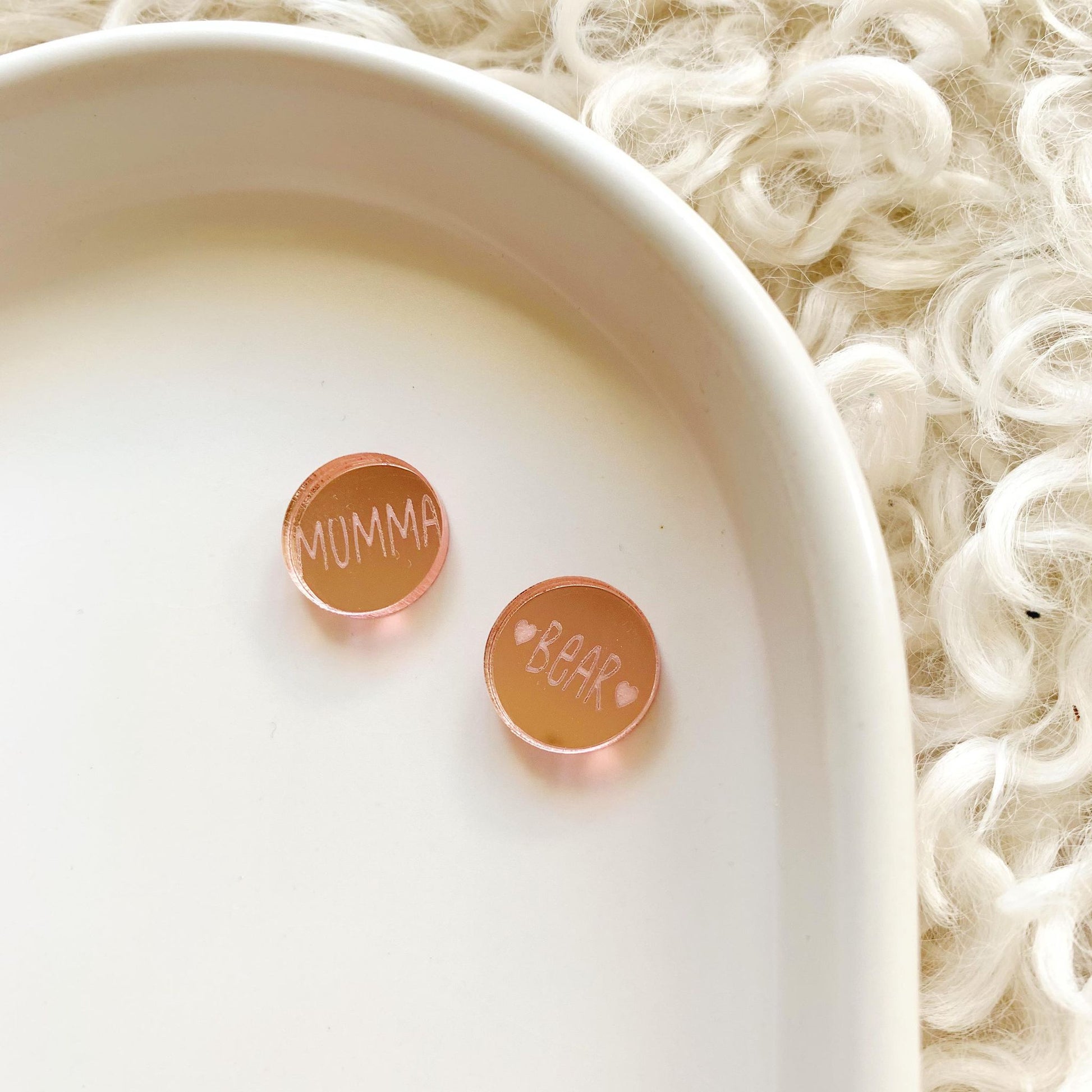 Pair of Circle Earring Stud Blanks Engraved with "Mumma" & "♥Bear♥" as pictured. 15mm Diameter
