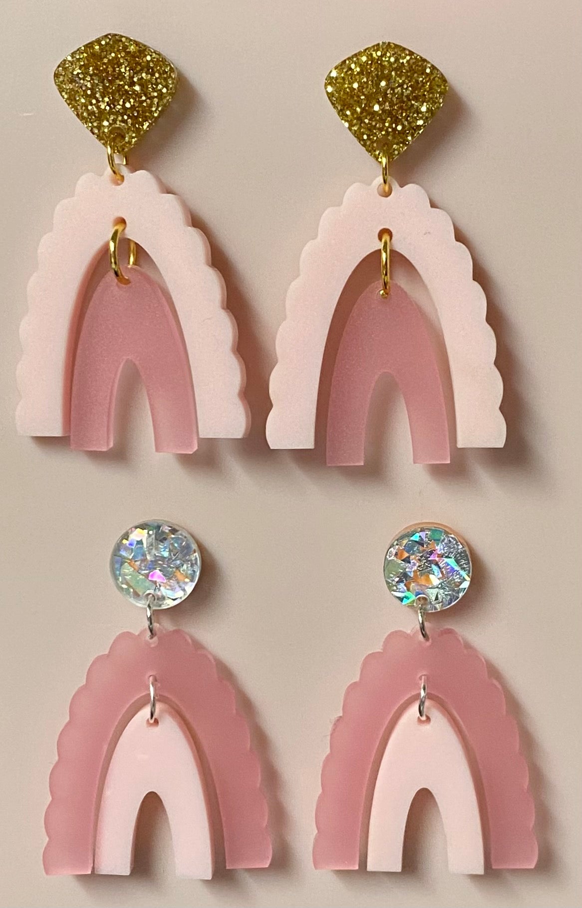 Our examples, began with taking a pair in Frosted Blush and a pair in Strawberry, then adding Chunky Holo Glitter 12mm Studs and Gold Modern Teardrop Studs. Measuring approx 53mm in length.