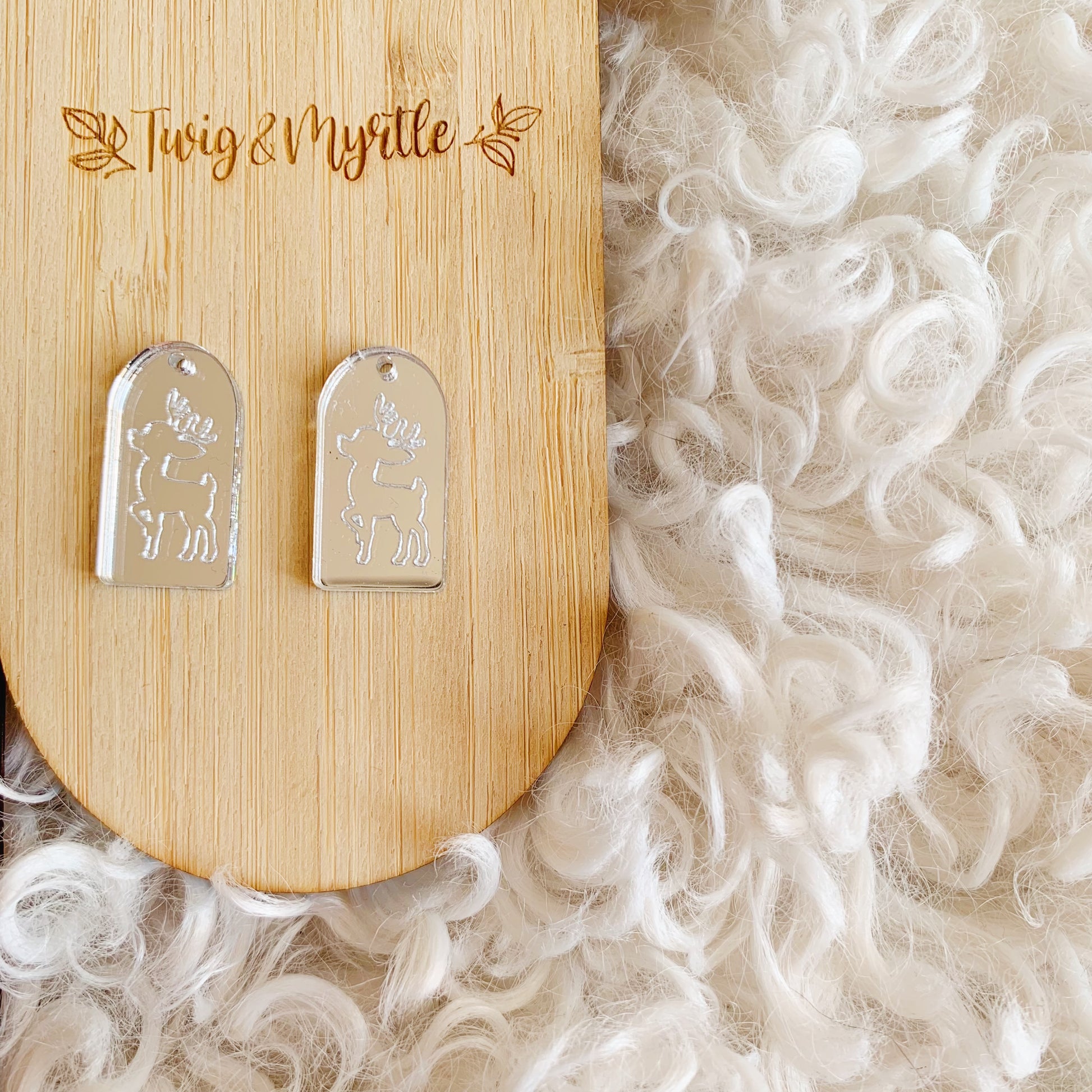 Pair of Engraved Mirror Mini Arch Dangles measuring 13.5mm x 26mm featuring a Reindeer