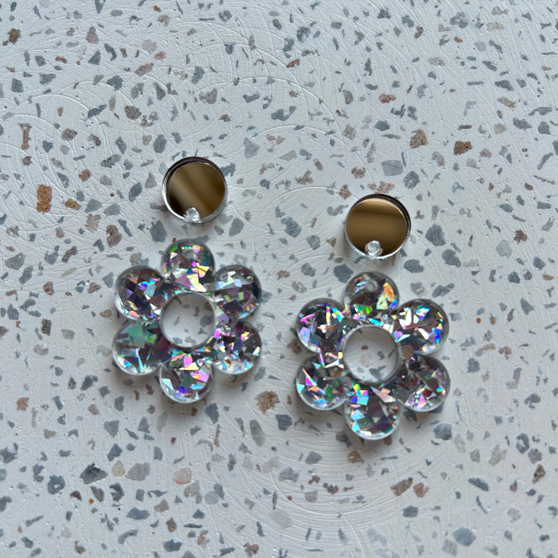 Pair of Retro Daisy Dangles each measuring 28mm x 30mm with a hole at the top. Available in a range of acrylics ready for you to add hardware and/or earring toppers.