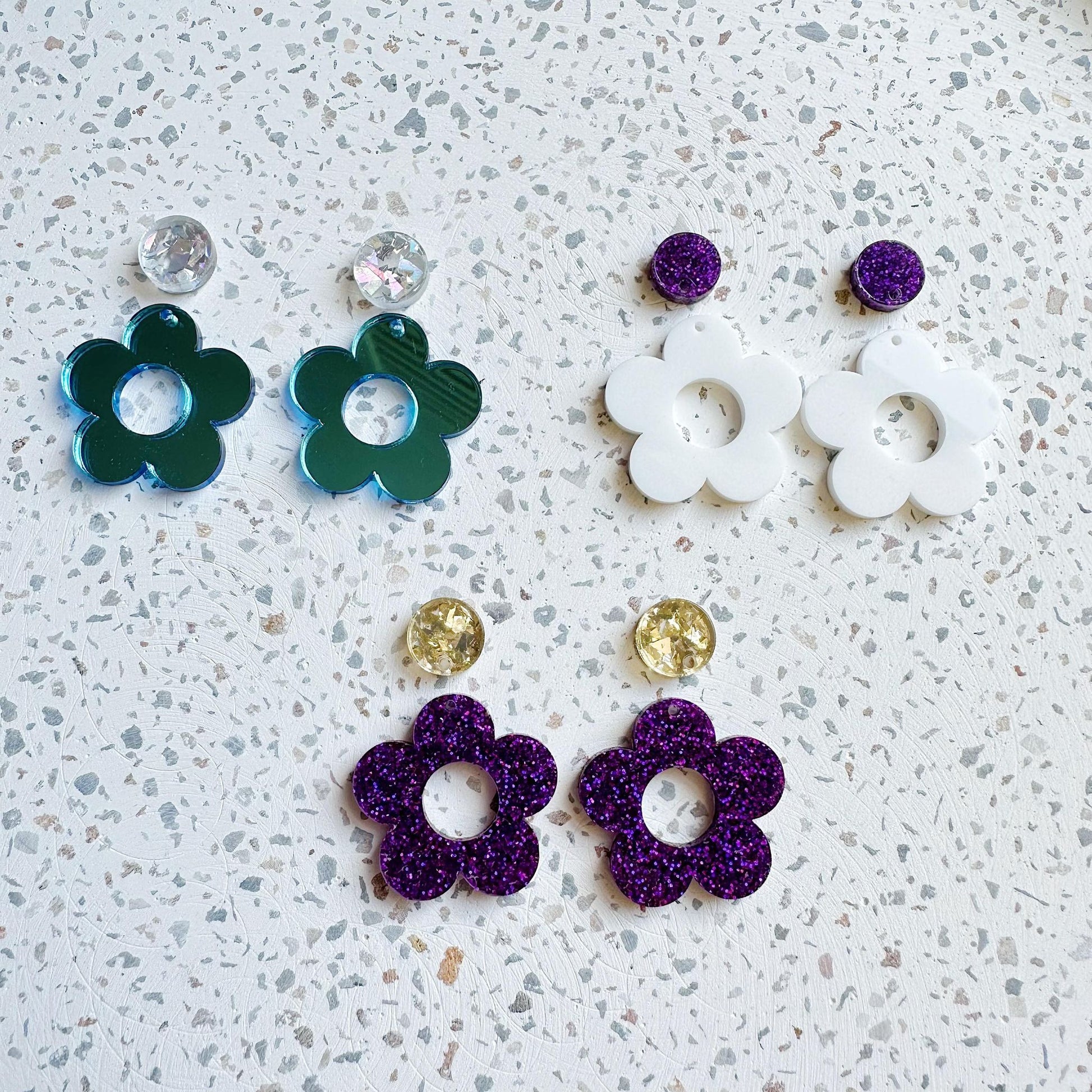 Pair of Retro Flower Dangles each measuring 30mm x 30mm with a hole at the top. Available in a range of acrylics ready for you to add hardware and/or earring toppers.