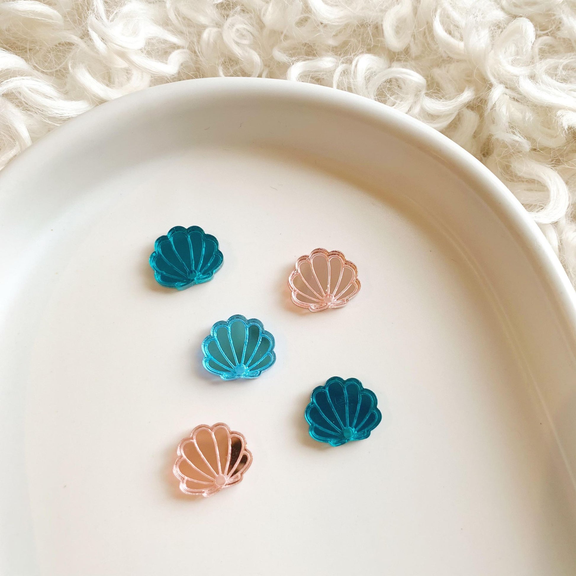 Pair of engraved mirror Seashell Stud blanks measuring approximately 15mm wide with hole to attached dangles as shown with our Sea Turtle and Dolphin Dangles.